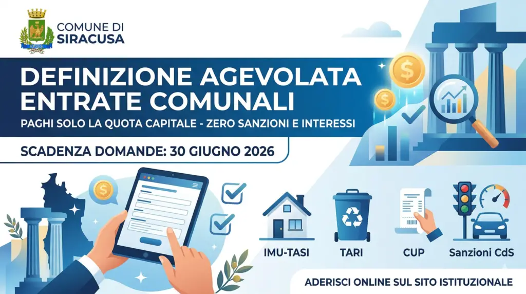 Approvate dal Comune di Siracusa con Deliberazione del Consiglio Comunale n. 53 del 17 marzo 2026 le istruzioni per presentare domanda di definizione agevolata e regolarizzare le posizioni debitorie relative ai tributi comunali beneficiando dello stralcio integrale delle sanzioni e degli interessi.